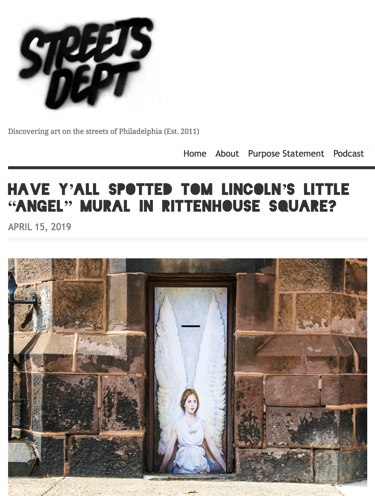 Philly street-art blog Streets Dept, featured the angel we installed on the side of Trinity Memorial Church. Under the headline “Have Y’all Spotted Tom Lincoln’s Little 'Angel’ Mural in Rittenhouse Square?”, the article compliments the mural’s “fine detail and painterly qualities.” “I really like this little mural,” says the author, Conrad Benner, “It made me smile to see online, and it certainly didn’t disappoint to see in person.” Streets Dept also featured the angel on Instagram.